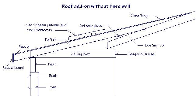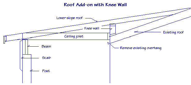 You may have enough height on the roof to avoid using a knee wall. Instead just go off the top of the sheathing, remove the shingles, nail on a 2x4 across the roof directly over the wall. The sheathing will nail into the sheathing of the roof at the top. The shingles will be replaced without flashing over the joint. The siding should be removed along the wall. the shingles are replaced with the addition of step flashing for this intersection. The siding then goes back over the step flashing.